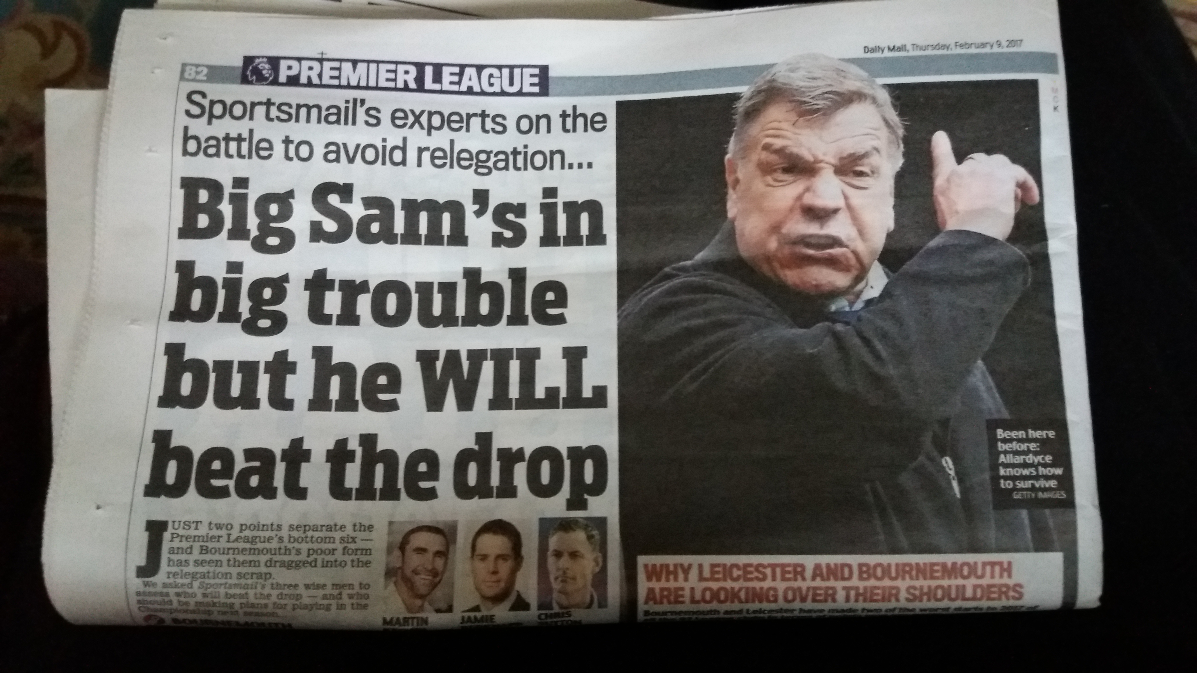The other day out of 14 pundits/journalists.... 11 voted us to drop, 9 votes sunderland and the other votes were shared on 5 with boro, hull and swansea, i think leicester and bournemouth had 1 each.