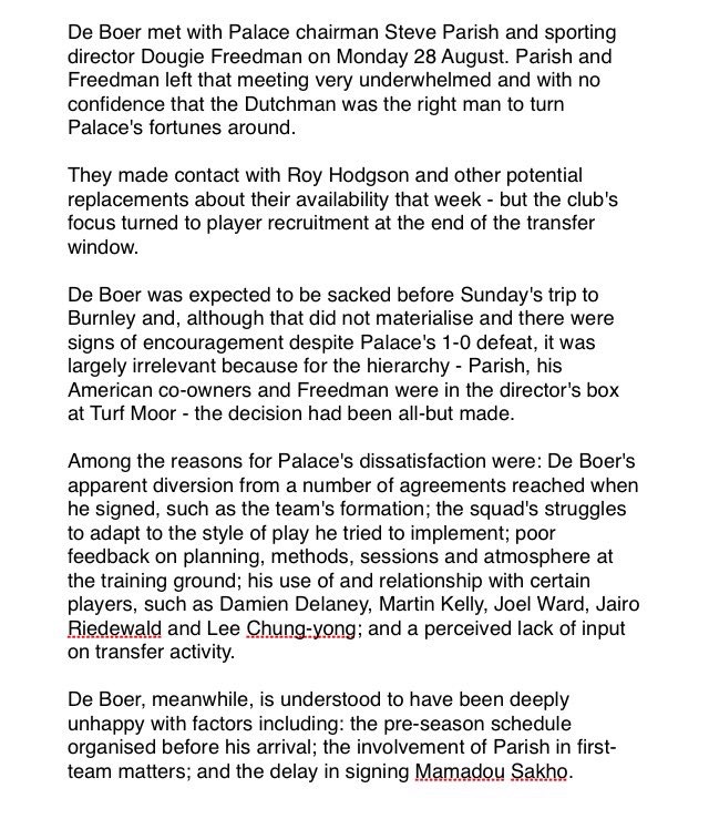 What has come out today in the papers is what I had been told last night by someone who is almost always spot on. Not always, but usually. He was a dead man walking before the season started almost. He had a 5 year plan to play 3-4-3 once he has settled in, not straight away. We lost 3 games to the U23's with a full strength team playing 3-4-3. That to me, is the most shocking. Parish knew he'd made a mistake after about 2 weeks. de Boer changed his mind on targets for transfers which is why we ended up missing out on a striker. He forgot! What is said about him telling Ward he was for sale the day before the season is true. He then put him into the starting eleven for our first game of the season at RWB and he got murdered. The bloke has had a total nightmare from start to finish. He HAD to go. I am pleased Parish stepped up and acted quickly. He hired a man who talked the talk but almost certainly, could not walk the walk. Parish is not to blame. So many idiots kicking off about this, he could have gone quite some time ago. The article posted in The Sun today is near on 100% the information I had last night. Give it a read if you haven't yet. In fairness, we played well yesterday which is why I understand some fans disapproval of the timing. It felt like we were getting somewhere. The vibe is he wouldn't have kept his job if we had pulled off a result.