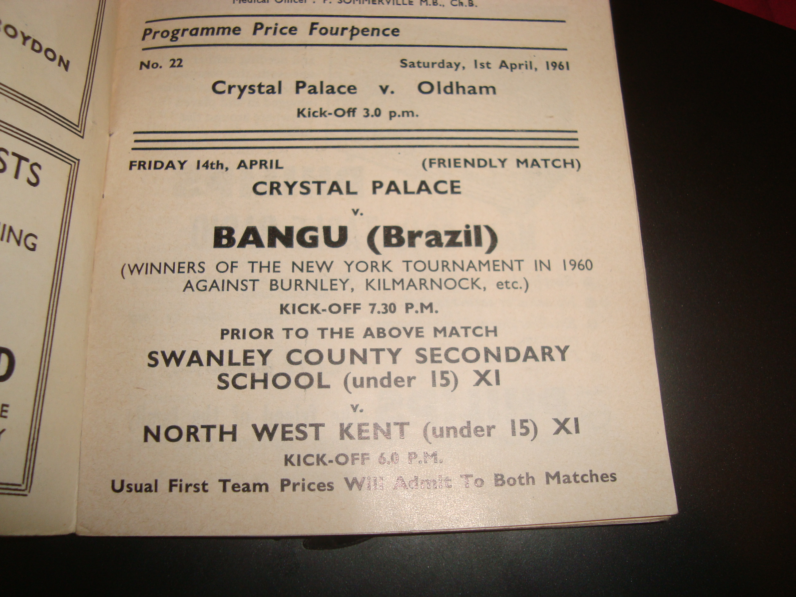 I was flicking through some old programmes and came across this flyer for a game to be played at Selhurst Park on Friday 14th April 1961 against Bangu of Brazil.