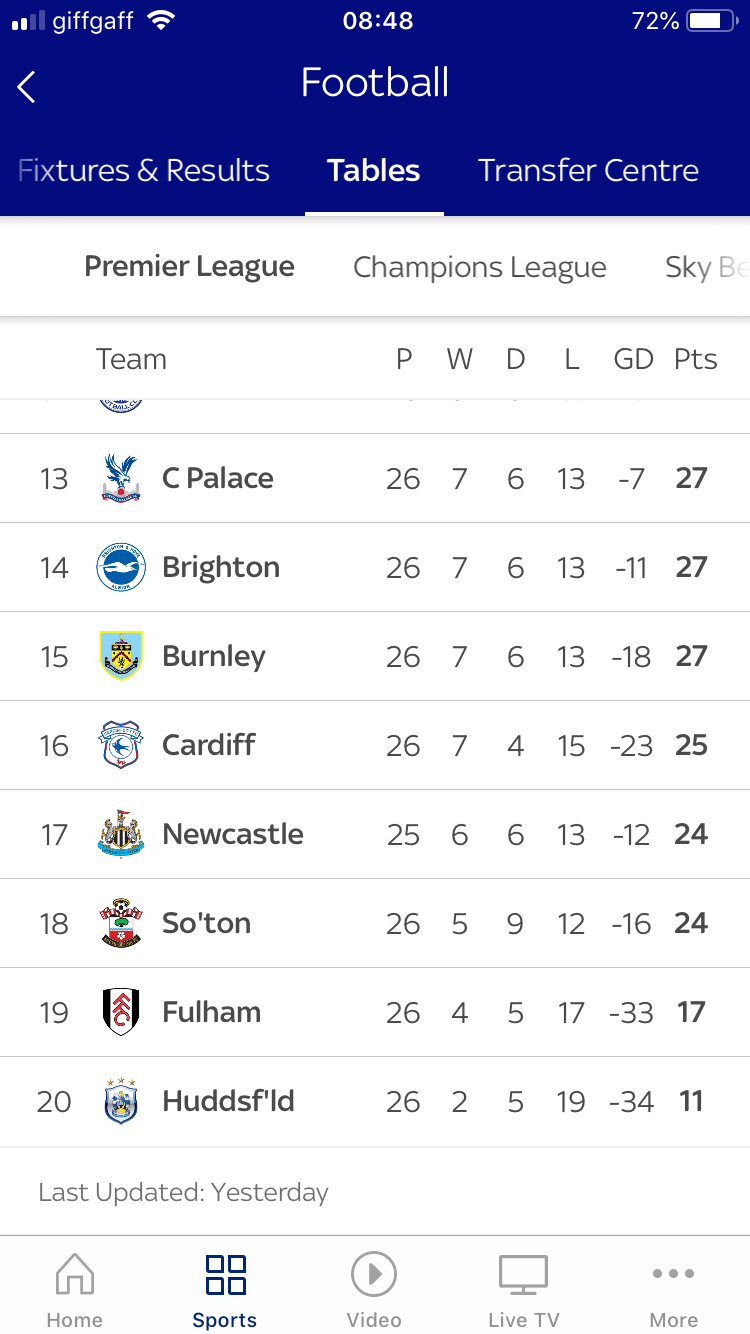 This post has been merged from a topic called 'Relegation = A real possibility ' by bexleydave Or.. You could look at the teams below and see that we create more than them and have a better defensive record than most, with our goal difference better than all. We’ll be fine, we only need 11 points from 12 games with the teams in and around us all coming up. Brighton are in free fall and Southamptons New Manager syndrome has run out.