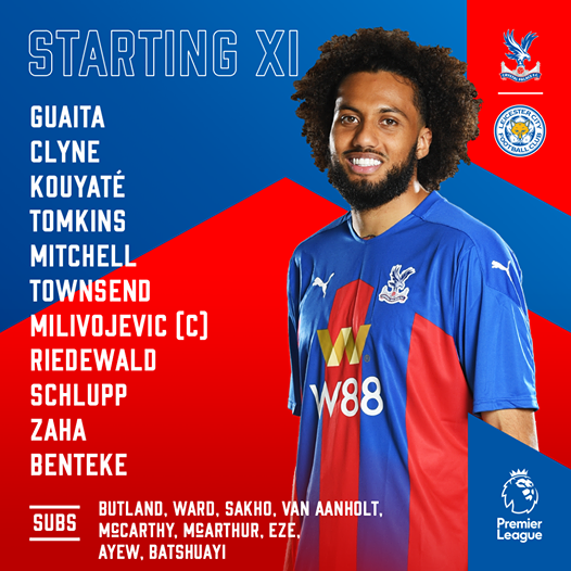 Palace: Guaita, Mitchell, Tomkins, Kouyaté, Clyne, Milivojevic, Riedewald, Schlupp, Townsend, Zaha, Benteke. Subs: Butland, Ward, Van Aanholt, Sakho, McArthur, McCarthy, Eze, Batshuayi, Ayew. Leicester: Schmeichel, Justin, Evans, Barnes, Amartey, Choudhury, Mendy, Praet, Thomas, Pérez, Iheanacho. Subs: Ward, Söyüncü, Morgan, Gray, Tielemans, Vardy, Albrighton, Ndidi, Fuchs. Happy that PVA isn't in the starting 11. It appears that Ward is on the bench for both teams