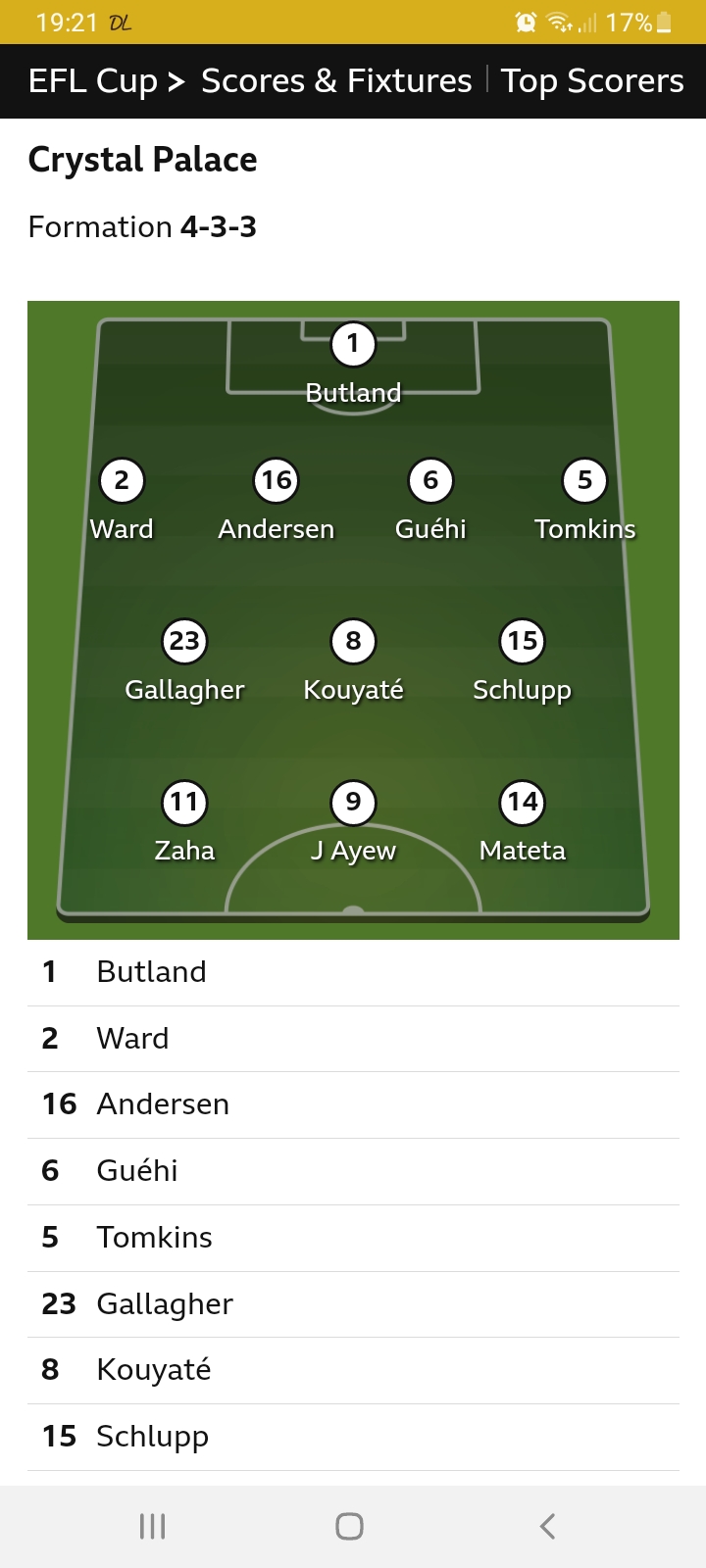 Palace: Butland, Tomkins, Andersen, Guéhi, Ward, Schlupp, Kouyaté, Gallagher, Ayew, Zaha, Mateta.