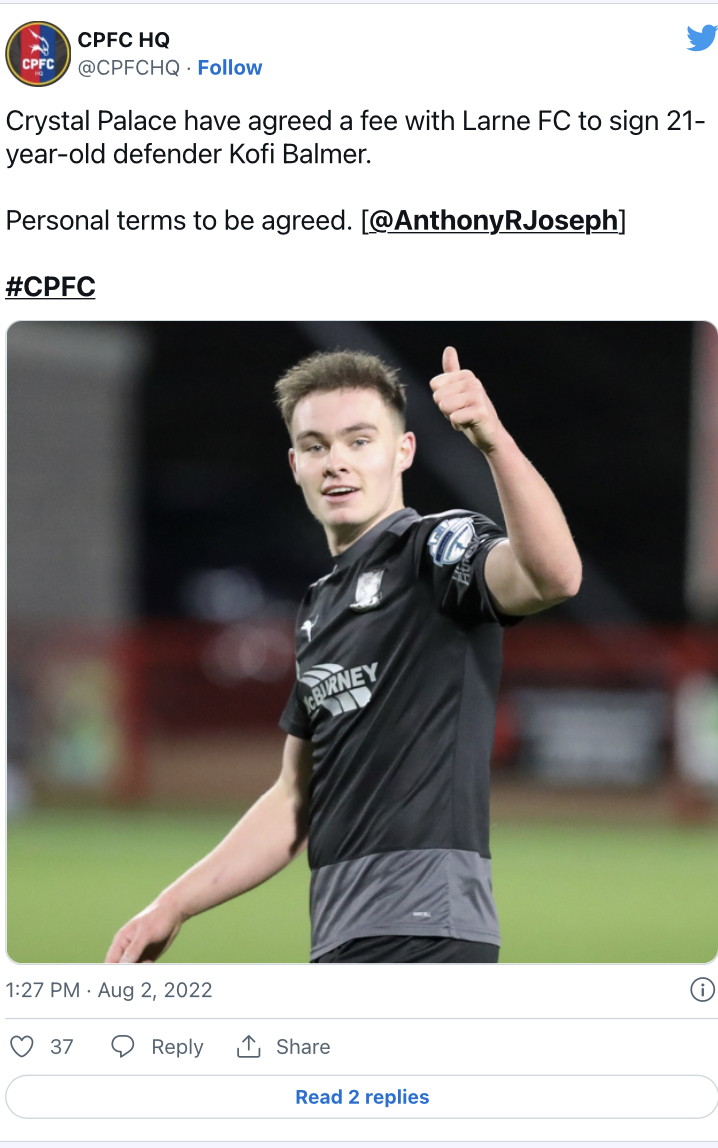 Breaking news on Ssn that we have agreed a fee with Larne for 21 year old Kofi Balmer.
