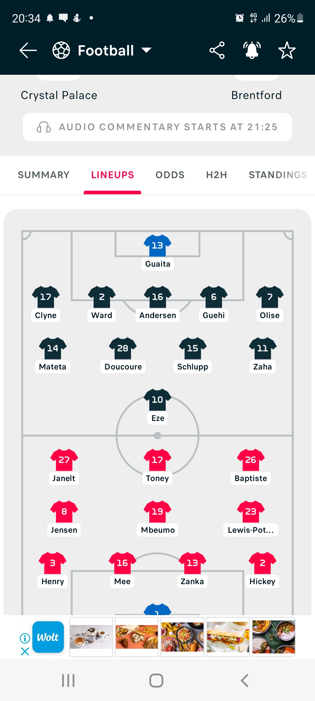 Kick Off 7:30pm [30.08.22 UK](Check time/date for other countries) Crystal Palace Starting XI: Guaita, Clyne, Ward, Andersen, Guehi, Olise, Schlupp, Doucoure, Eze , Zaha, Mateta. Subs: Johnstone, Mitchell, Milivojevic, Ayew, Edourard, Ebiowei, Richards, Phillips, Rodney
