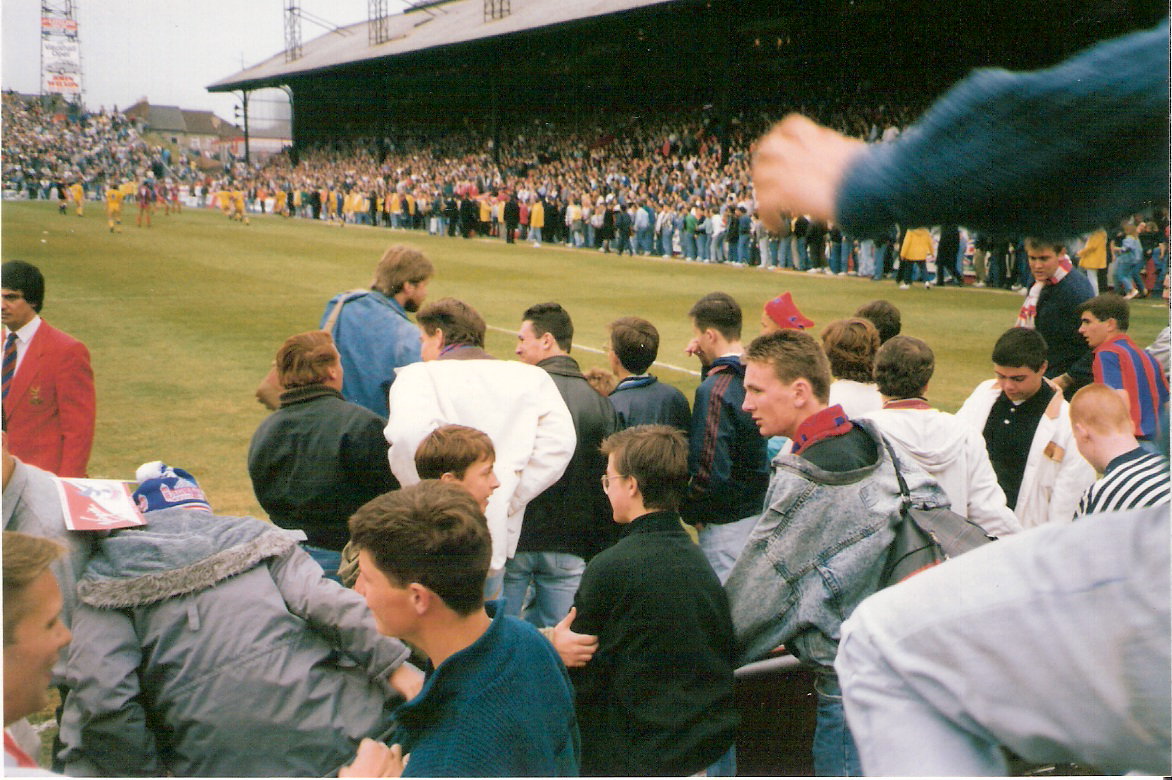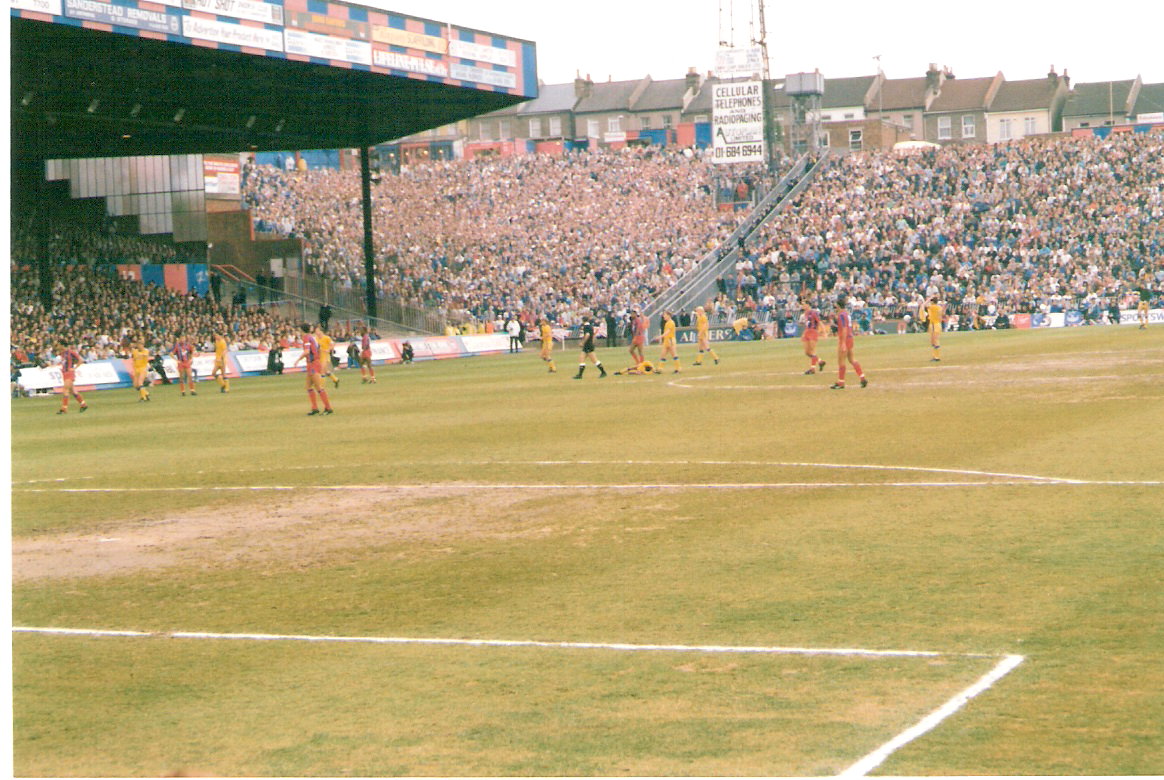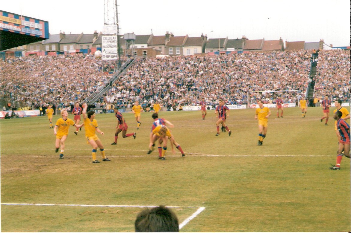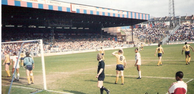 A Suckling goal kick. It was a rare sight throuhout the 80's to see the Holmesdale so rammed pack. You knew it was either a very special game for us or that Chelsea or Pompey had come to town!