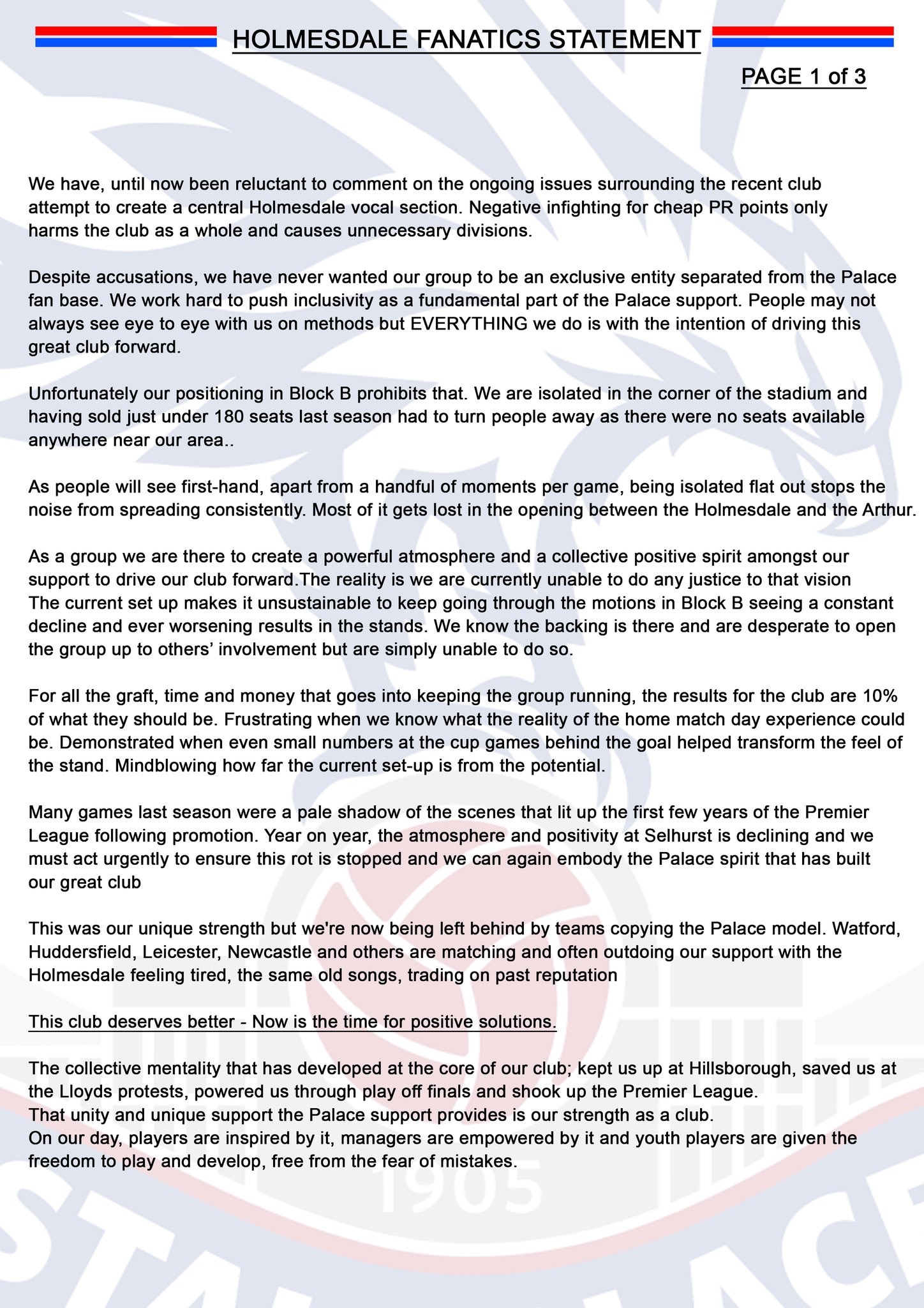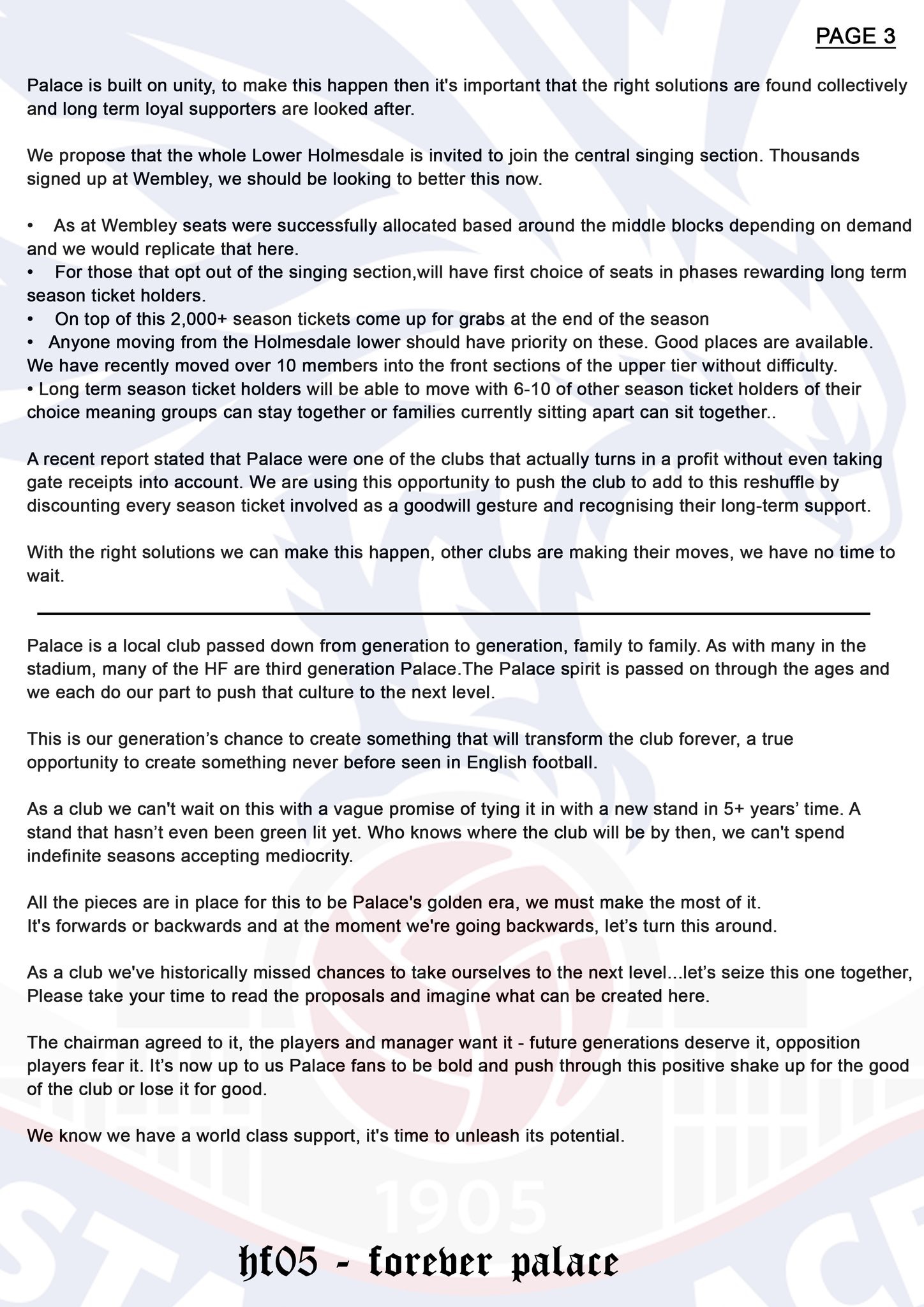 Sign this if you want to nudge Parish to get this sorted out more than that awful club statement. 870 signatures so far. I stress here the wording... Crystal Palace chairman Steve Parish, offered the Homesdale Fanatics (HF), room in block E of to progress their support of the club and displays. Steve Browett's comment: The HF wanted a 3 block central singing section with themselves at the top of the middle one - block E. This would have meant moving hundreds of fans who like their seats, prefer to sit rather than stand and dont want to move.