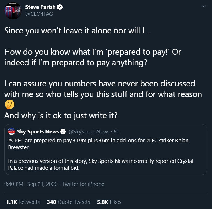 Ha, just seen that Parish has spoken out again on Twitter. Just like I (and probably others) were saying, Sky's 'correction' earlier was a typically weak retraction and just acted like they had jumped the gun on an offer for Brewster as opposed to the complete fabrication that it was. SP has just tweeted this: [Tweet Link]