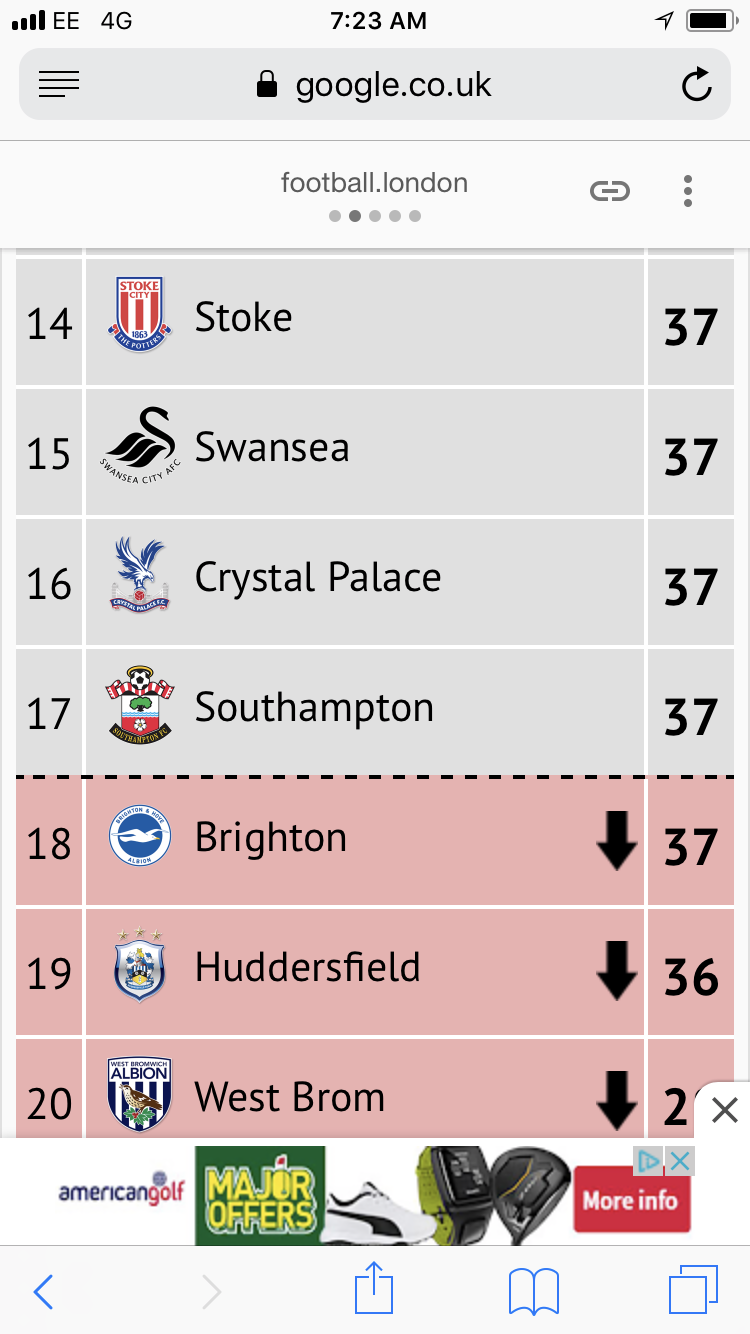 Check out the photo, hope it displays. It’s based on my score predictor from last 4-5 games for all teams involved in relegation battle. I think it’s going to be tight. Nah. No way are we picking up only 3 more points with Southampton finishing on the same point total as us. Edited by Brentmiester_General (17 Apr 2018 7.32am)