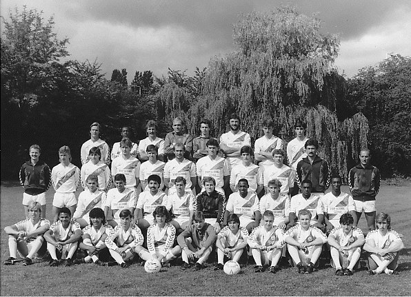 Johnnyeagle, I can fill in the missing names, they're on the back of this photo! BR-Paul Rains,John Salako,Alan Pardew,Gavin Nebbeling,Dean Greygoose,George Wood,Geoff Thomas,Mark Hone,Phil Barber,Russell Green. This was dated August 87.