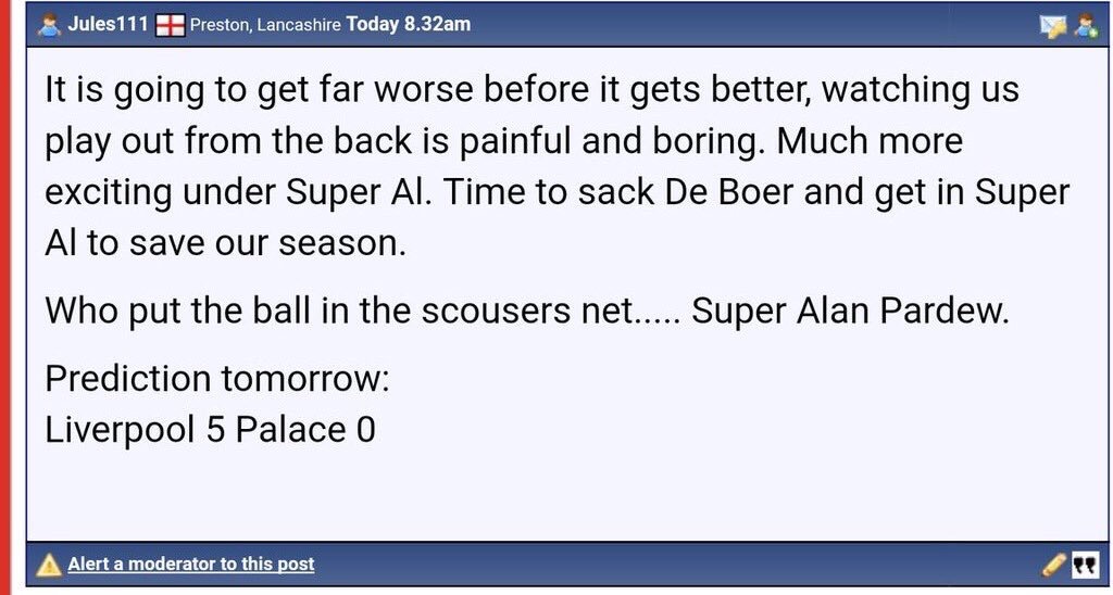 Are you on a wind-up? After the Huddersfield game you posted this: [Link] "I firmly believe we will turn things round and start moving up the table. Granted, yesterday's result was woeful but we still had chances to get back in the game and salvage a point. We have already got a better squad than last year and with a few more additions can finish mid table. I for one am willing to give FDB a chance. Rome wasn't built in a day. Jules" And then you post this thread after a much improved performance.
