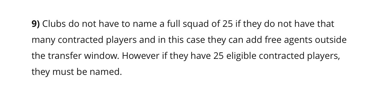 Thank you for the 'Link' however it doesn't categorically state that ALL players over 21 have to be named in the 25 man squad. I am fully aware of the HGP criteria and the fact that those under 21 need not be named in the '25' but not aware of the so called 'New rule' which you have mentioned. In any event one doesn't HAVE to name 25 players which of course has been applicable to us ! Why has the likes of lapado been named along with mutch and Kai Kai to a degree where 12 months these players weren't considered good enough. Given a free transfer of boateng being able to leave. I haven't got a defiant link.