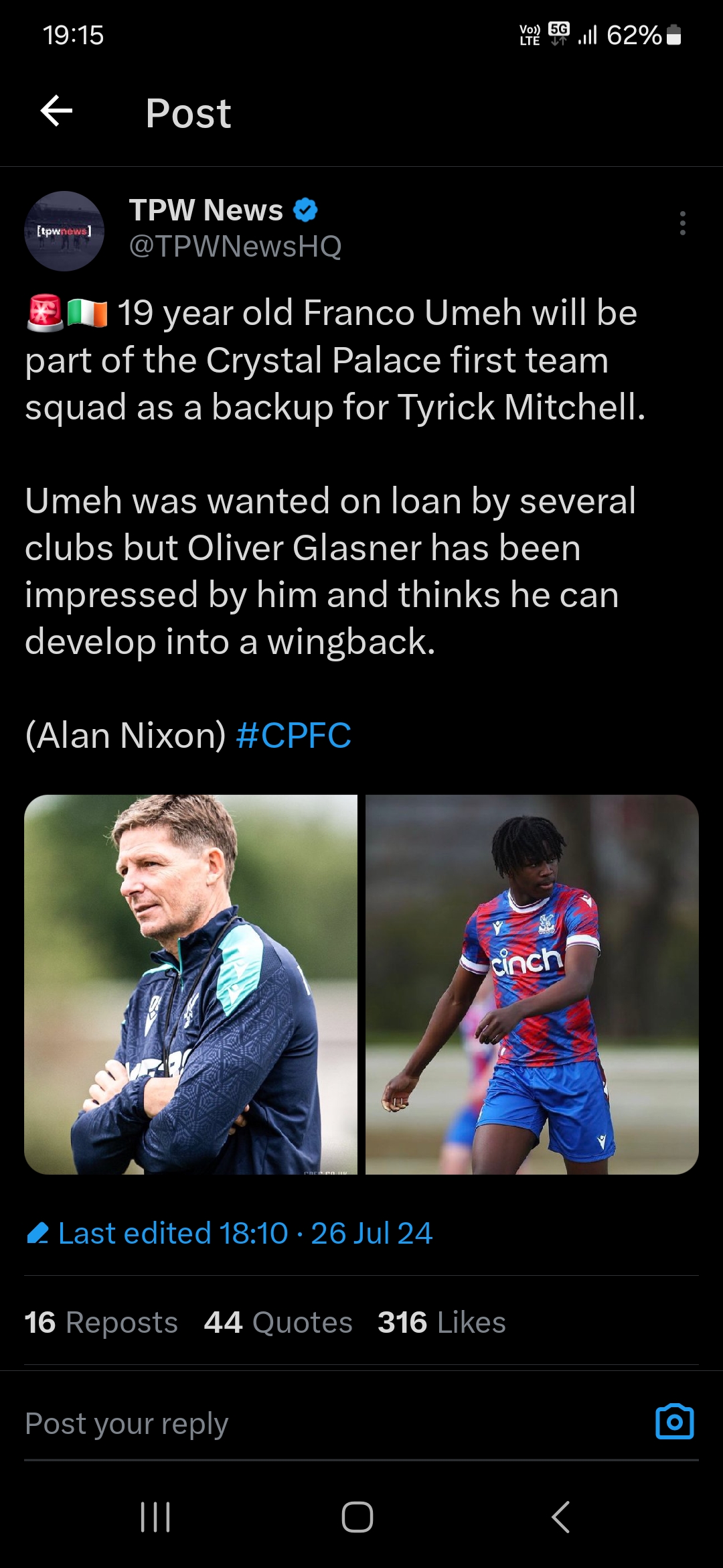 Can anybody explain why we are continually linked with Trevor Chaliboah at Chelsea? His agent presumably. Left behind from their summer tour. Out of favour and rightly wants out of the club if he's not going to play. Palace seem obvious as a destination IF Guehi leaves as the agent thinks they will have pots of cash to pay some huge transfer fee to Chelsea and huge wages to his client.