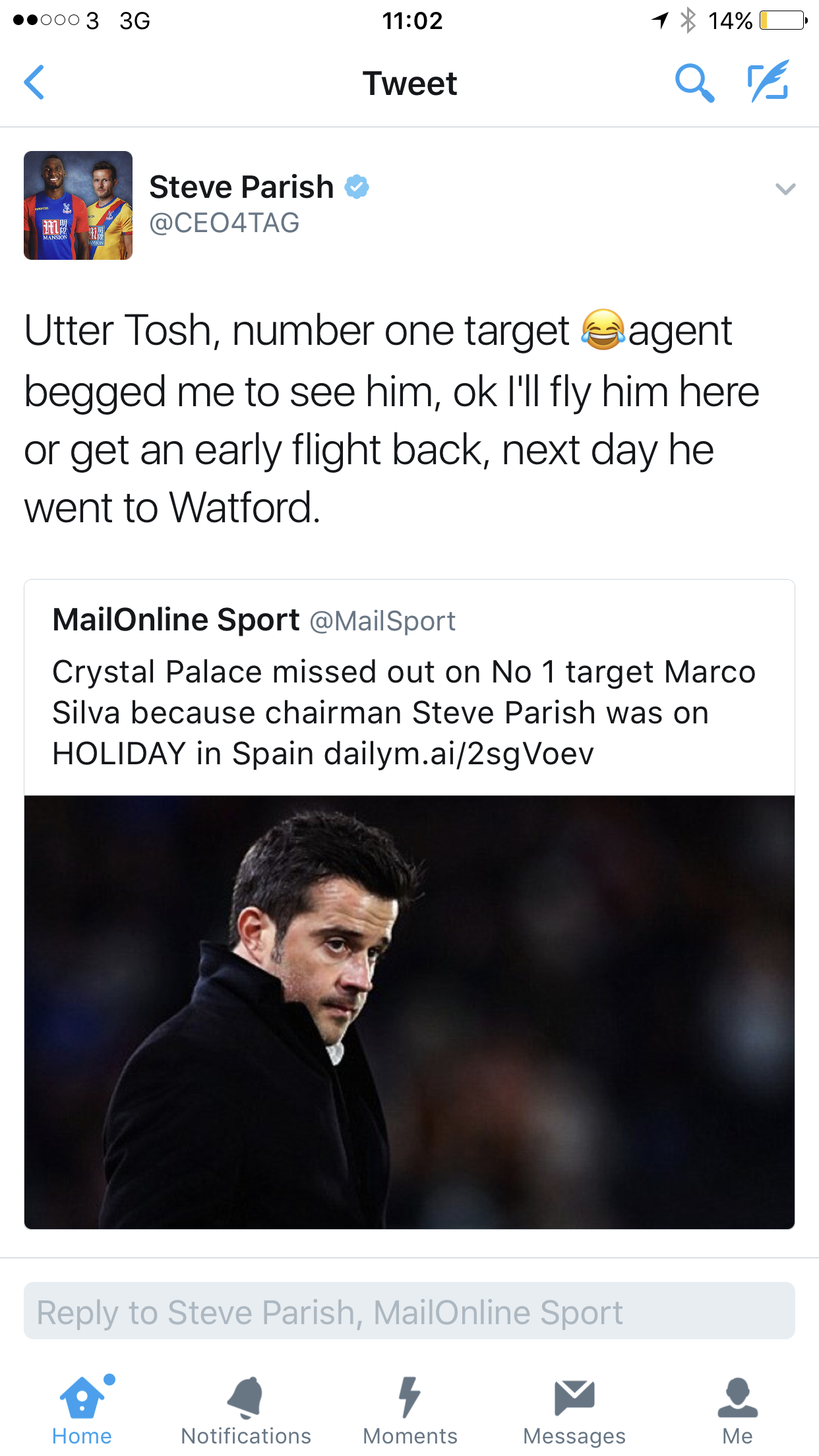 This post has been merged from a topic called 'Parish on Silva' by kenbarr The way SP conducts himself this trash in the Daily Mail just had to be as I say trash. Well done Steve keep up the excellent job you are all doing for the club.