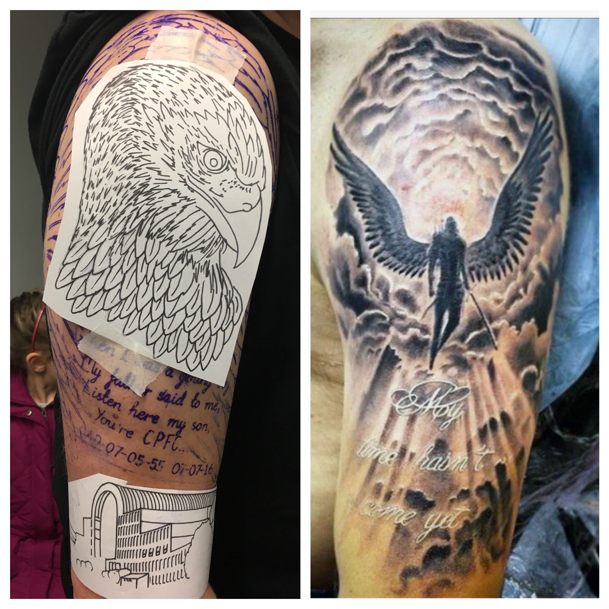 I'm not into tattoos at all but I think it a very nice way for you to remember your dad. To me the eagle doesn't look right though, it reminds me of a our budgie we had years ago who would puff out his feathers and strut up and down on his perch. I mean no disrespect by this, but that is genuinely the first thing I thought of when I saw it.