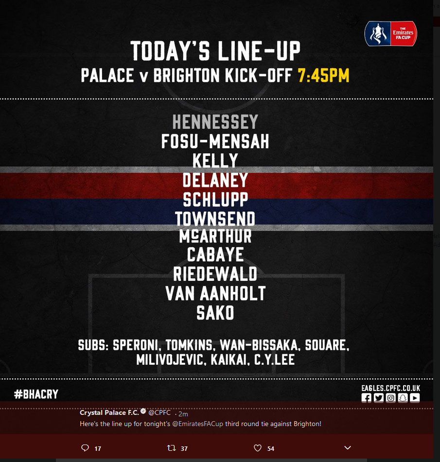 I hope Roy puts out a very strong team tonight, we have a great chance to go for in this cup and no point being worried about things that might never happen (injuries). We havnt played in over week and then have a break of 4 and a half days till Burnley. Madness if we dont go for it tonight with a strong starting 11. I think he will leave tomkins out as the risk is too great if we lose another CB. Zaha will be left out because he is or best player. Benteke needs a goal s should be starting.