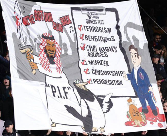 Although it is true what the banner says one issue I have with it is tribalism. If Palace were taken over by a Saudi billionaire the majority of Palace fans would be like any other football fan accept it because it would ensure Palace become a European side within the next 3 to 5 years. Top 10 is a dream and that looks unlikely this season. It is hypocritical to have a banner when if the opposite happened most Palace fans like any other football fan base would welcome it cause most fans care more about success than their owners. Plus if the PL did not accept it would have been hypocritical. You have Man City owned by a state effectively. Chelsea owned by a Russian owner. If you say no to Newcastle there is a double standards. There has also been allegations of corruption against the Chelsea owner, Man City and nearly every rich owner. Most rich owners have allegations of corruption against them many of them are true Newcastle are no different. Money has taken over football a long time ago. Most owners see clubs as businesses. Abramovich didn't take over Chelsea cause of the location of course it was due to profitability. Same with City, PSG and any other football club. Edited by Zaha127 (24 Oct 2021 6.49am) I don’t believe this would be the case with Palace. I think most Palace fans take pride in us being a small community club who are punching above our weight. Many, including myself, would turn their back on the club if this type of blood stained investment happened. Having a club to be proud of is more important than winning. Newcastle fans are in the same bracket as West Ham and Liverpool who seem to think they are entitled to success. No thanks.
