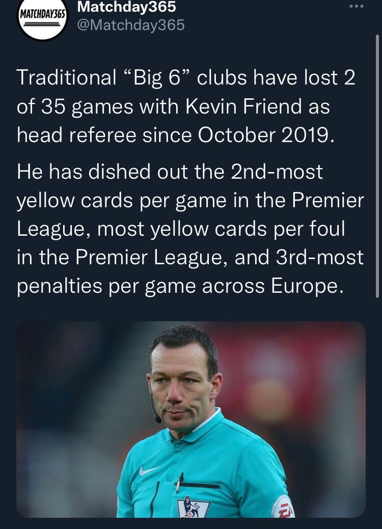 The real answer to all this top 6 club bias (which is nothing new by the way) Palace then should have scored again within 2 minutes of the restart to take the lead, this then makes it an entirely different game for the rest of the match.