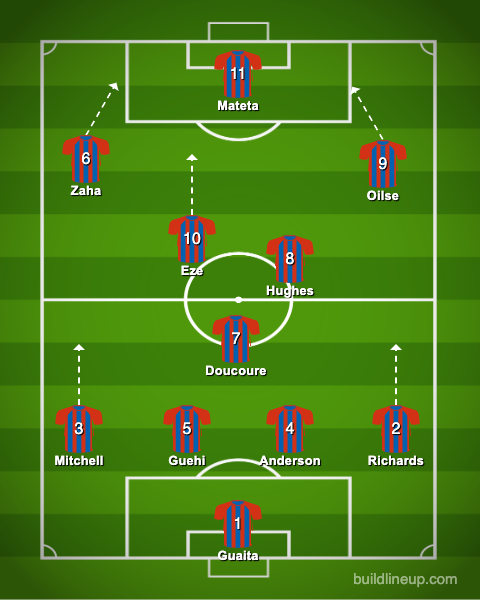 Depending if we make anymore signings and seeing who we are linked to. I'd me happy with this Guaita Wan Bissaka Anderson Guehi Mitchell Doucoure Gibbs White Olise Eze Zaha Lozano Edited by Hootie121082 (29 Jul 2022 12.42pm)
