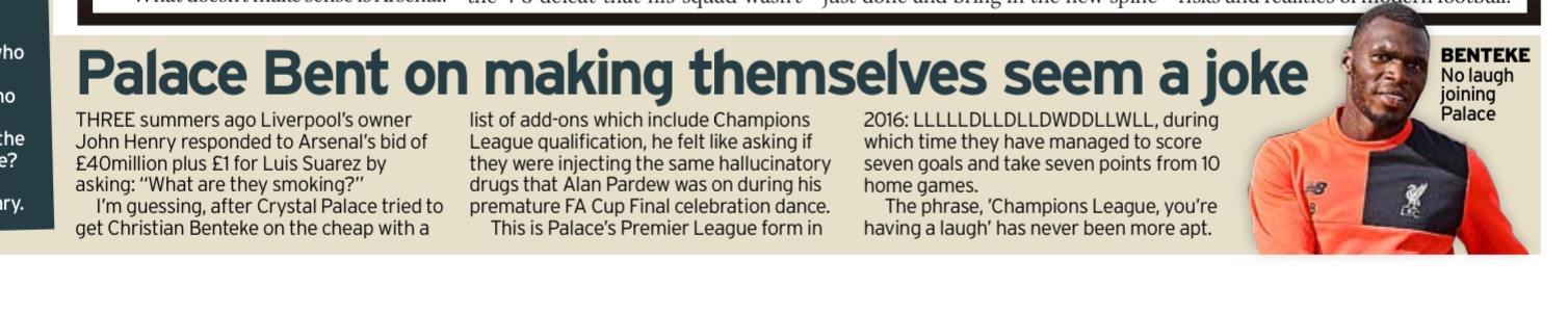 Anyone SERIOUS about doing a deal would not insert a clause that depended on CL football at Palace. There isn't a football club in the country that would agree to part of a payment depending on such a condition in relation to us. If it wasn't out-and-out stupidity the only other possible explanation is that it was done knowing that it would scupper the deal, leaving the owners with a ready-made excuse, on I September, that they tried hard, but failed, thus keeping the cash in their pockets and placating the support. Personally I prefer to believe it was a ridiculous bit of willy waving by Parish, rather than a Machiavellian plot to excuse a poor window. I`m pretty sure that most contracts have these sort of clauses ,I bet even craig Harrison had a clause that boro got a certain amount if he played for England !! but this is so high profile and its been leaked makes me suspicious that its more than likely been leaked by Liverpool. they have done that to make palace pay up and do the deal . pre the internet all this stuff didn't get poured over and dissected by us fans , it happened or it didn't , winds me up to be fair