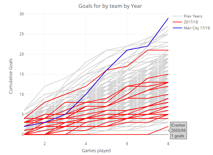 Now that we have amassed 2 goals, we are not the lowest scorers eight games into the season Surprisingly, it was Everton in 2005/6 who only picked up 1 goal in spite of finishing 4th the previous year.They didnt hit two in a game until Round 14 They finished the season 11th