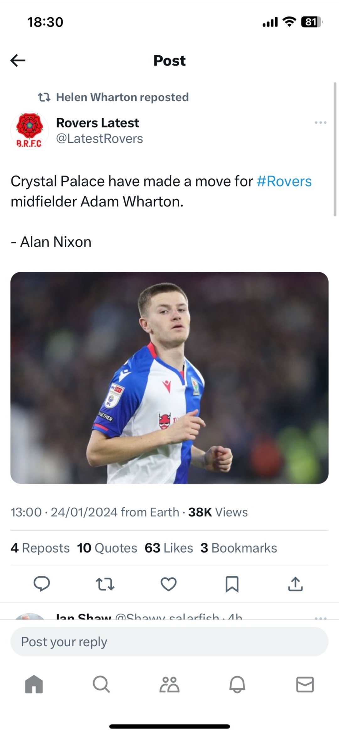 Rumour has it that Blackburn are desperately short of cash Indian owners with cash stuck in India for "legal" reasons (??) Given his age and likely price, I suspect this is one where we will not be gazumped (famous last words...)