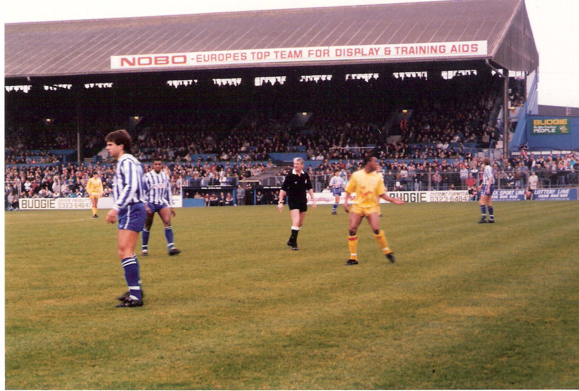 26.12.88 Brighton 3 Palace 1 Another defeat at the Goldstone and another poor performance, in front of 3,500 travelling Palace supporters. My main memory of the day was the usual gallows humour from our lot: On came Rudi Hedman for his senior debut and spotaneously Palace fans start a rendition of The Specials hit 'Message to you Rudi', with someone taking the lead 'Stop your messing around' and the rest of us backing with the 'ahh ahh ahh' bits..... It's one of my funniest memories on the terraces and just so typical Palace in the face of another Brighton humiliation. Pic 1: I think this is Bremner heading number one for Brighton. You can just about see Brian Parkin diving in vain. Infact, I believe this was his final senior game for Palace as Suckling returned in our next game and saw out the season. was there for that one too