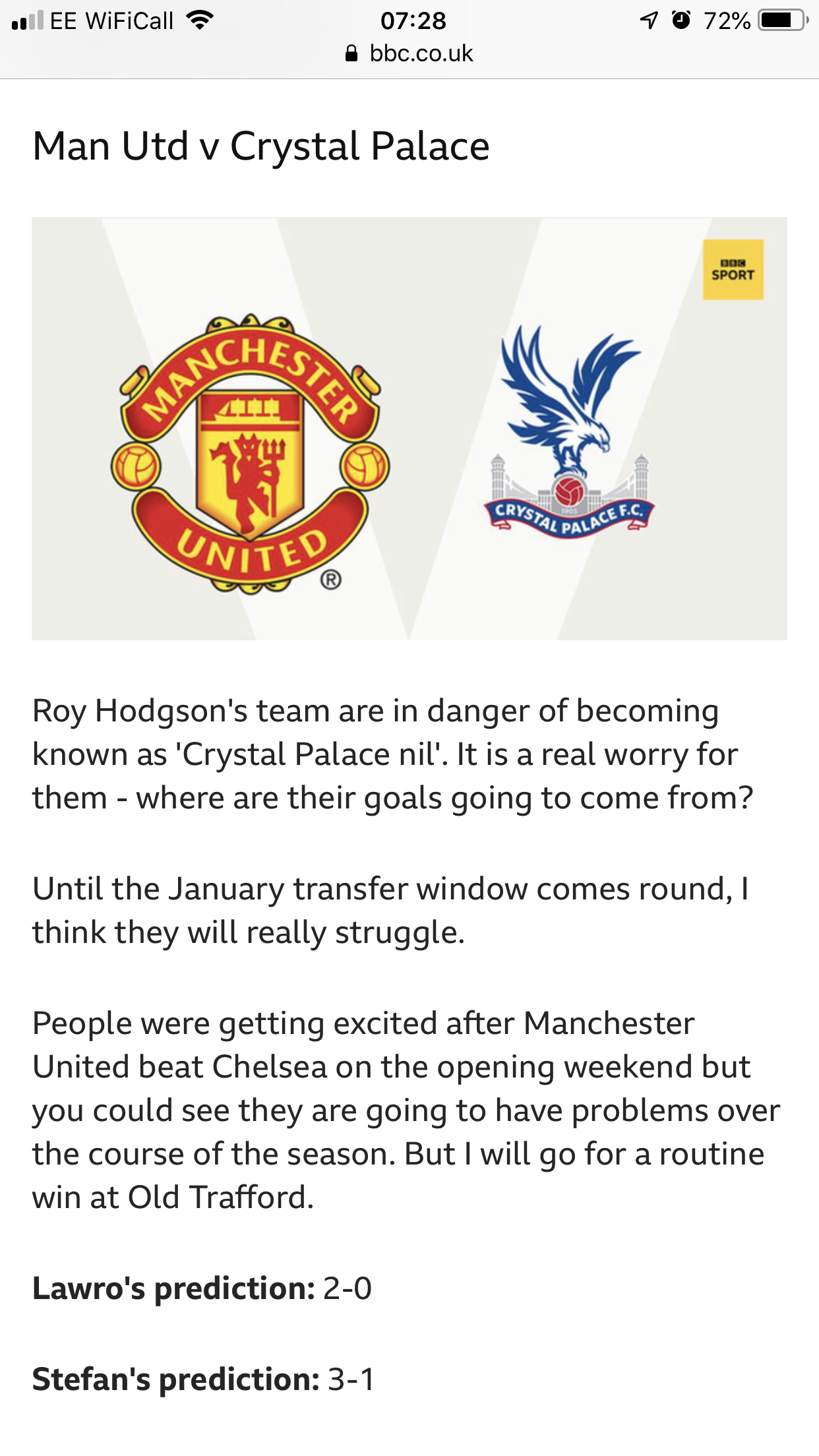 I have no idea how this one is going to go. My head is saying 3-1 to United but my heart and gut is saying we are going to get something from the game. Il go with my heart and say 2-1 to Palace.