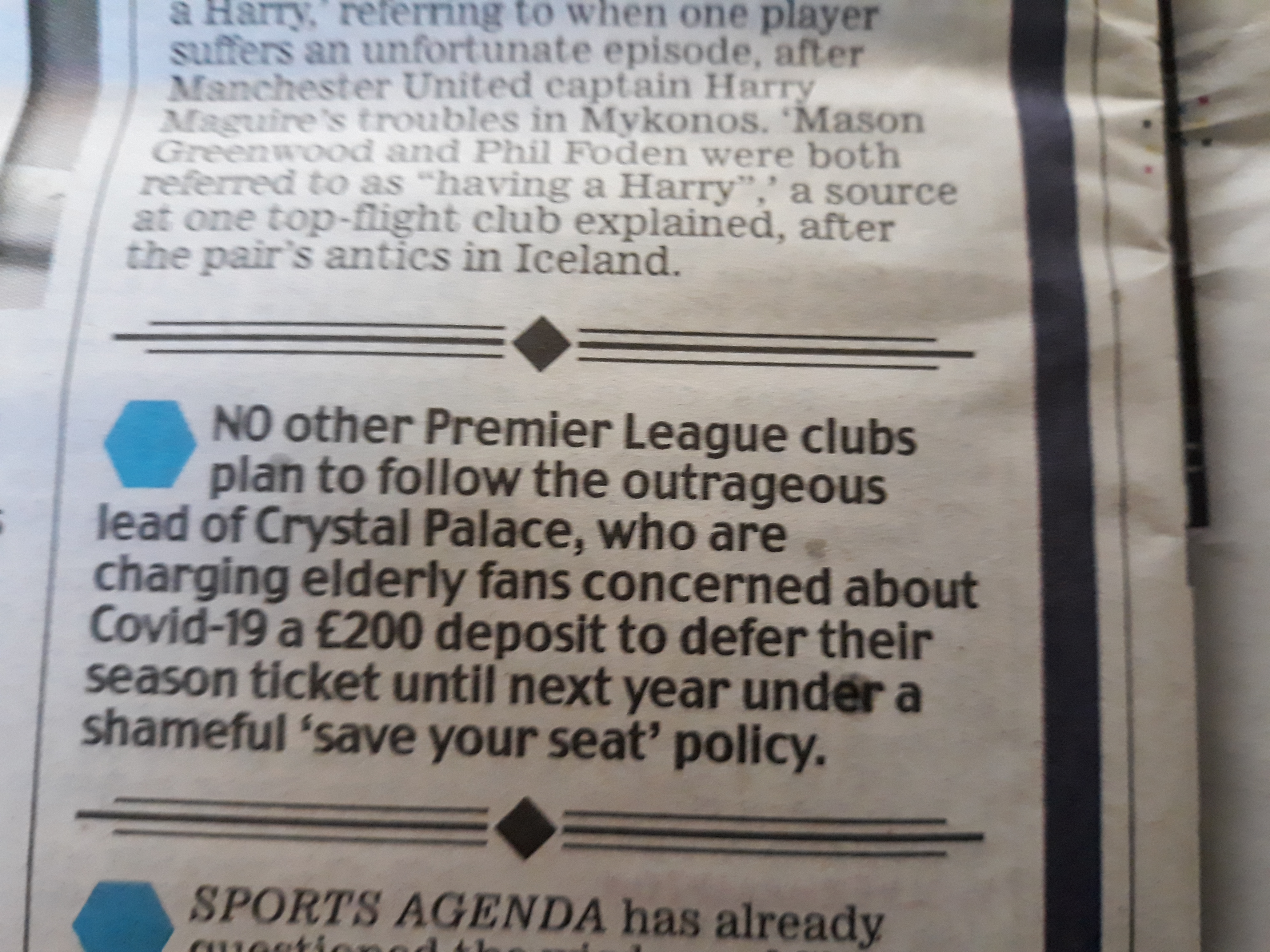 I have just renewed our two tickets but not expecting to see much live football for a while yet. It’s effectively an interest free loan for the club but as I am lucky enough to still be working ok I don’t mind helping out my team. I realise it’s a drop in the ocean when it comes to players wages and transfers etc. but I try not to get too hung up on modern day football finance and am just enjoying Palace mixing it with the elite.