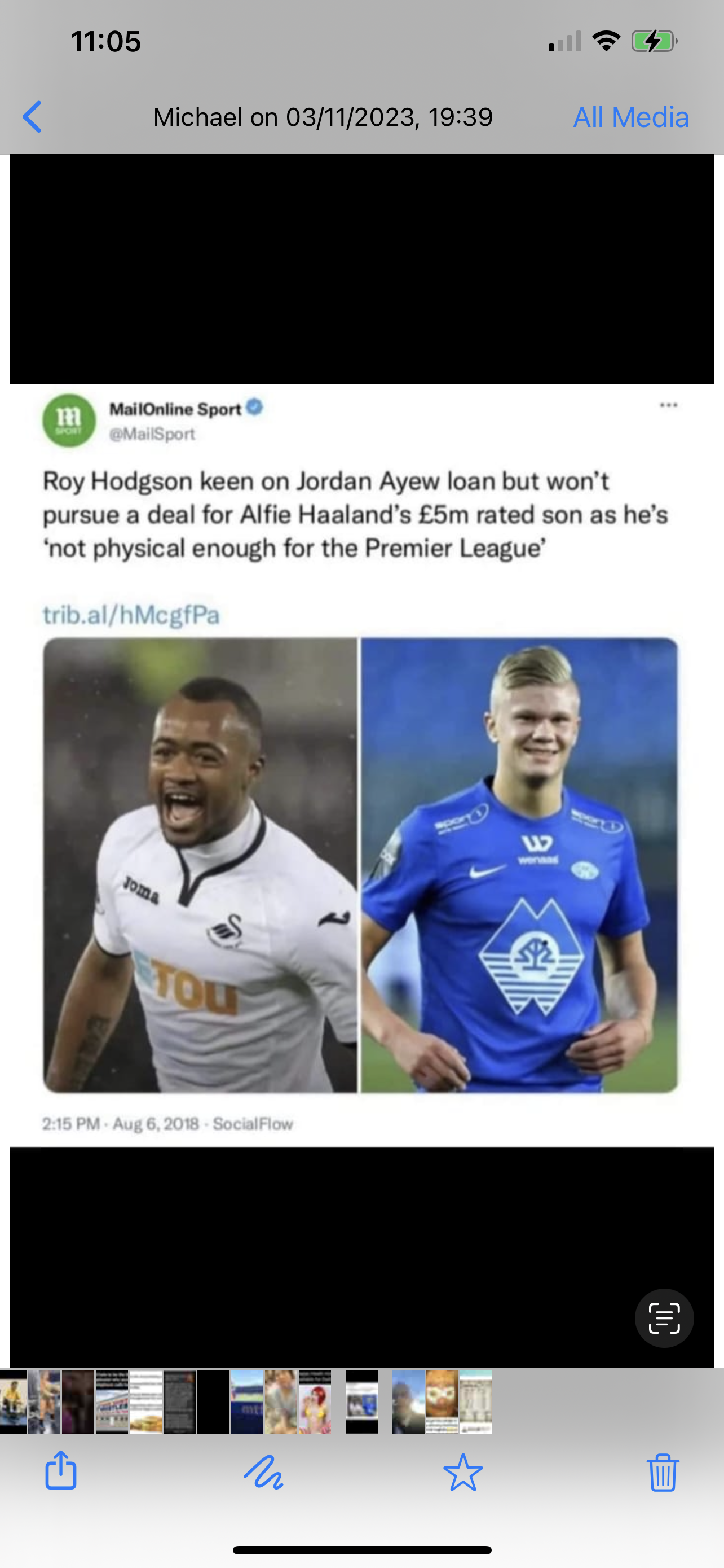 Having lost out on Virgil van Dijk we had a similar opportunity in 2018 with a certain youngster called Haaland. However, as with VVD we turned him down, this time in favour of our goal machine Ayew. Source comes from the Mail so who knows but hilarious if true.
