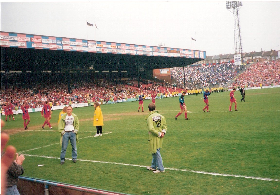 1/5/93 Div 1 Palace 3 Ipswich 1 Fast forward 18 months, and a team with realistic ambitions of the title were now fighting for their lives in the top flight. The pictures you're about to see are of the infamous lap of honour, where we celebrated 'survival' but were unbelievably relegated 1 week later. Bar administration, probably my lowest point as a Palace fan. Goals from Young, McGoldrick and Armstrong put us 8 points clear of third to bottom Oldham. They had to win all their last 3 games, including an away match at title chasing Aston Villa to stand any chance whatsoever of catching us. We had 49 points come the last game of the season, and no team had ever gone down with that many points. Guess what happened?