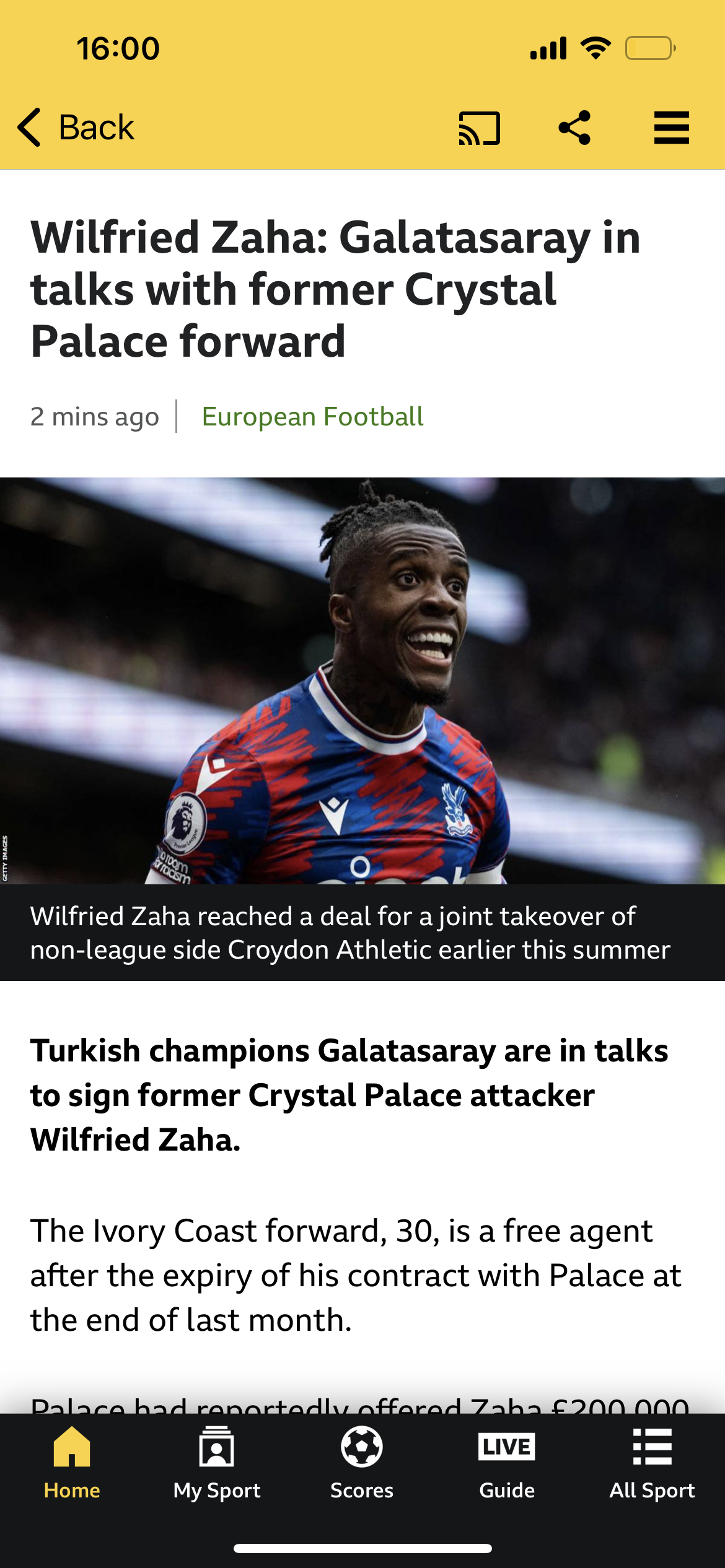 This is from Sky News Transfer Centre . . . Galatasaray close to agreeing Zaha deal The deal is not done and the option of a four-year contract remains on the table from Crystal Palace. Zaha has been training at Palace and a new deal there is still an option for the winger. The Ivory Coast international is a free agent after his contract expired at Selhurst Park earlier this summer.