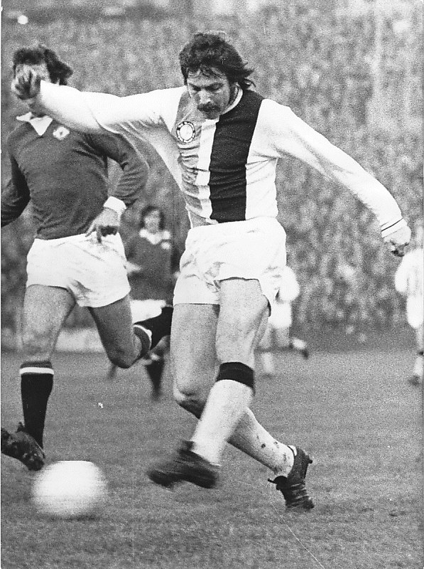 Here's one of The Don in that famous game, with a United player trailing in his wake