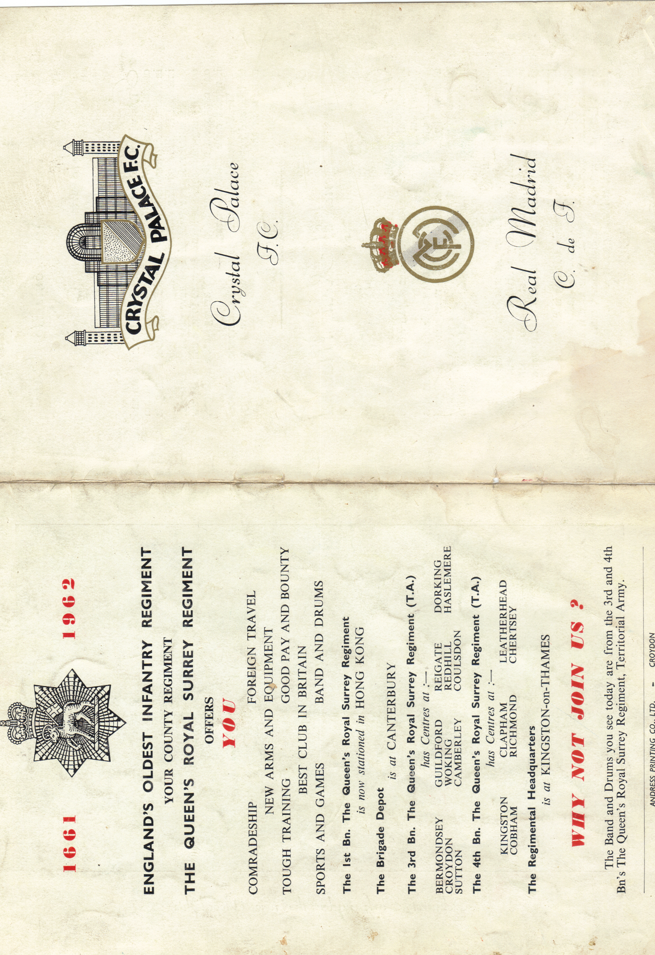 Following the match this evening at Bournemouth is there any other old fart who remembers Palace then in the old third division? playing a friendly with Real Madrid. In the early sixties in the days when Madrid were really the best side in the world by miles. They had Franco Di Stefano,5 times European Cup winner, Ferenc Puskas,3 time European Cup winner Francisco Gento 8 times European Cup winner and playing for them that night. Can anyone remember the score. I am sure Palace scored through full back Terry Long from half way between the penalty box and corner post on the Real goal line, Holmesdale Road End,but maybe not.