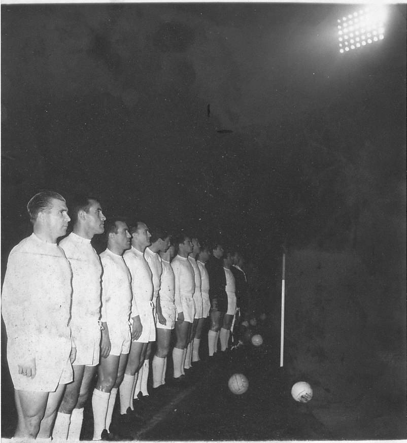 Here's the Madrid team lining up before the game, the legendary Ferenc Puskas nearest the camera