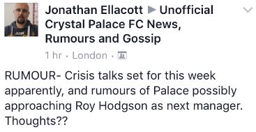 Am seeing rumours crisis talks are due this week and that Roy Hodgson has been approached. Not sure how true this is so dont shoot the messenger.