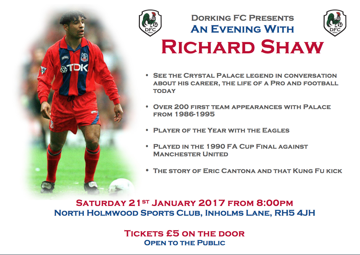 Hi I'm from Dorking FC, one of the oldest non-league clubs in Surrey now playing in the Combined Counties League. I just thought any of you on this forum who live near to Dorking might like to know that we will be having an evening of conversation with Richard Shaw coming up on Saturday 21st January. He's kindly given up his time and will be chatting about the 1990 FA Cup Final, playing in the 1990/91 team, his work now in the Academy and with the U23s - and, of course, Eric Cantona's kung fu kick. He'll also chat with members of the audience informally. It's open to all, so anyone from this forum who would like to come along is very welcome. It starts at 8pm (so hopefully enough time to get there after the Everton game) at North Holmwood Sports Club, Inholms Lane, North Holmwood RH5 4JH - just south of Dorking. Admission is £5 on the door (it's a fundraiser for our club which runs on an amateur basis). There's more detail on our website [Link] Thanks for reading this. I hope you're OK with us letting you know here about the event - if not, I'll gladly remove the post. Edited by DorkingFC (12 Jan 2017 11.12am) Edited by DorkingFC (12 Jan 2017 8.37pm) Edited by DorkingFC (12 Jan 2017 8.38pm)