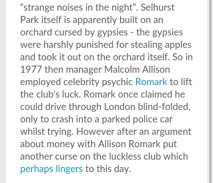 I remember a gypsy lady putting a curse on Selhurst Park in the days of Big Mal,i don't recall it ever being lifted !