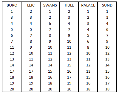Having previously deluded myself with a refusal to truly believe we could go down, Saturday's abject display has hammered home the brutal reality of our situation. With too much time on my hands at work, I wrote down the current league positions of our remaining opponents and did the same for our five relegation rivals. Screenshot attached. The aim of this was to try and work out exactly how much of a mountain we have to climb. Below are the averages of these lists just to summarise exactly how hard we have it compared to the other teams. Obviously the lower the number, the harder the fixture list. Middlesbrough: 10.7 Our next two fixtures are against Stoke and Middlesbrough, winnable games and a hypothetically easier pair of fixtures than any other team on that list has. If you take the same average but starting after the next two rounds of fixtures, the task ahead looks even grimmer; Middlesbrough: 10.3 (0.4 league positions harder) My point is that I believe these next two games will make or break our season. I realise there are other variables at play but if we don't take 4 points then, for me, the task will just be too hard.