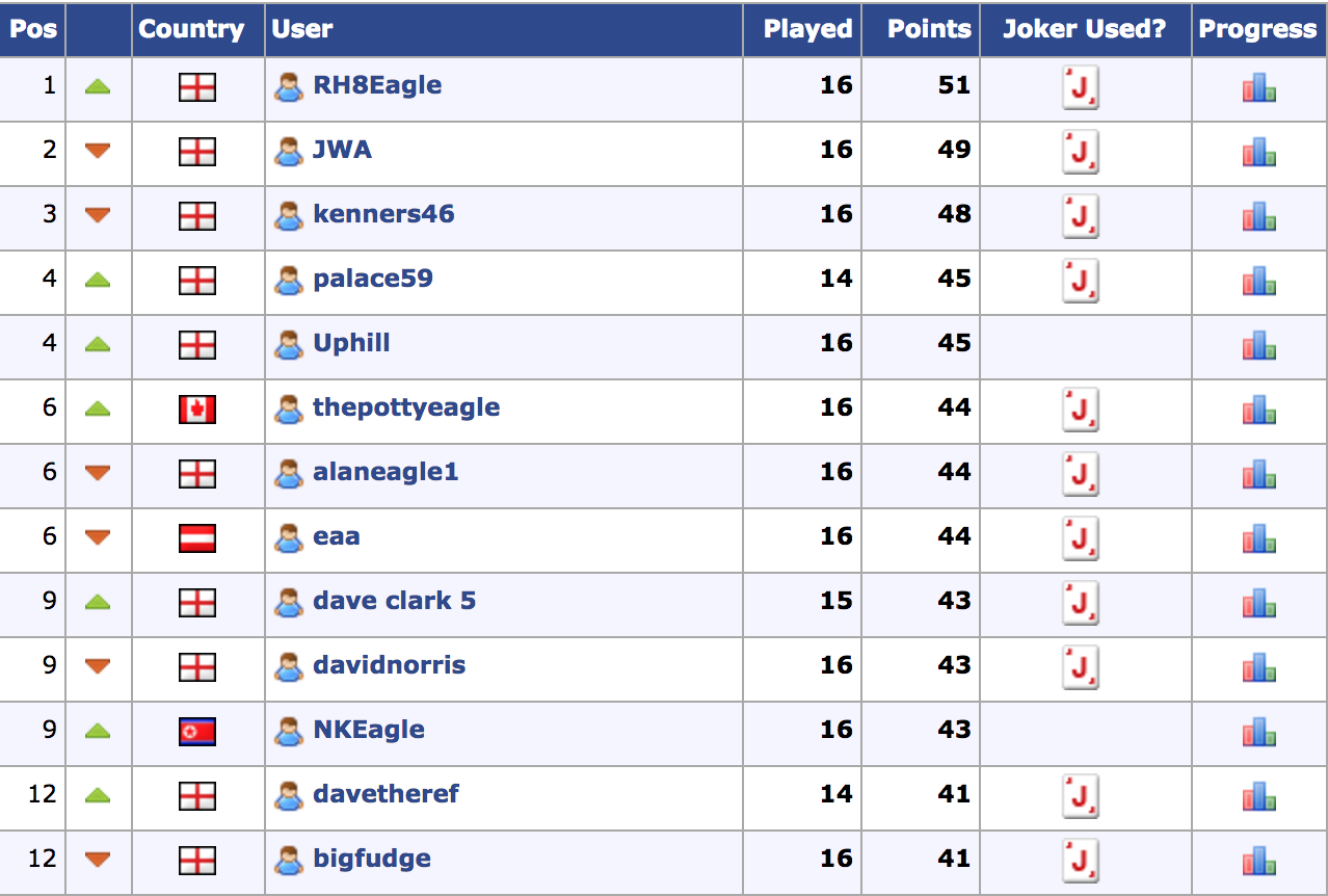 Congratulations to RH8Eagle who won the latest Prediction League which ran up to the end of January. The top 12 in the league are shown below in the attachment. The final Prediction League of the season started with the 1-1 draw against Newcastle today, so make sure you get predicting for the remaining games of the season.