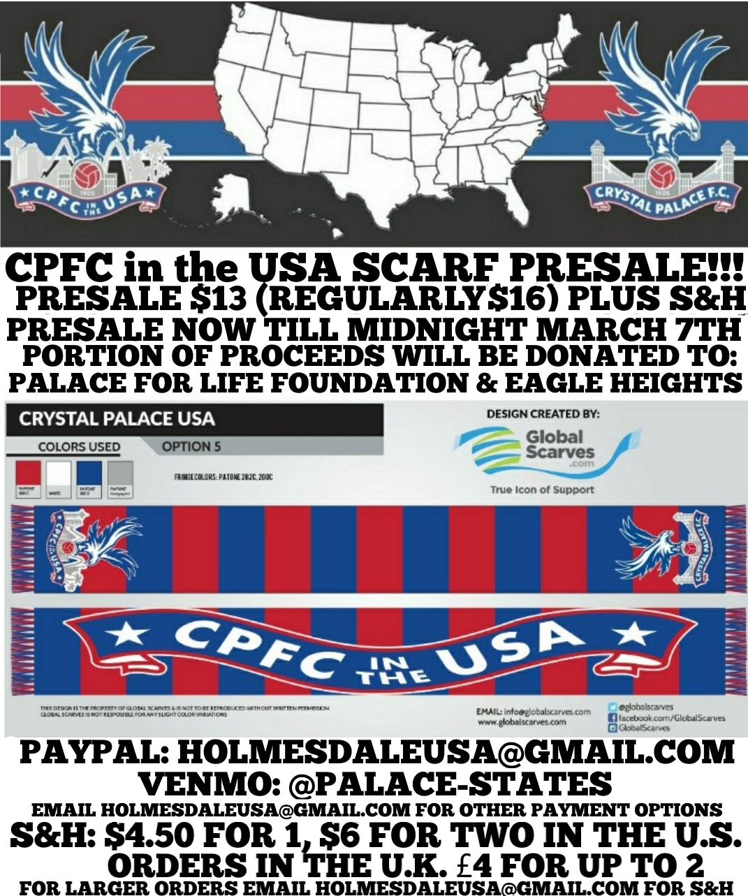 CPFC IN THE USA SCARF PRESALE!!! PRESALE TIL MIDNIGHT MARCH 7TH We will be shipping these from within the UK for those in the UK and Europe so s&h is 4 pounds for up to 2 scarves in the UK. Email us for larger orders or european shipping! We are judging how many scarves we are getting made by the presale numbers so if you can get your orders in to confirm that you get a scarf! Cheers! COYP! We hope to use the money raised to bring you more CPFCUSA merchandise and to help make any CPFCTOUR events bigger and better along with donating to CPFC Foundation and Eagles Heights!