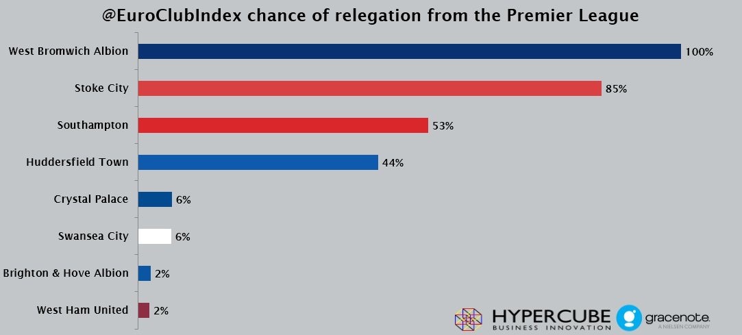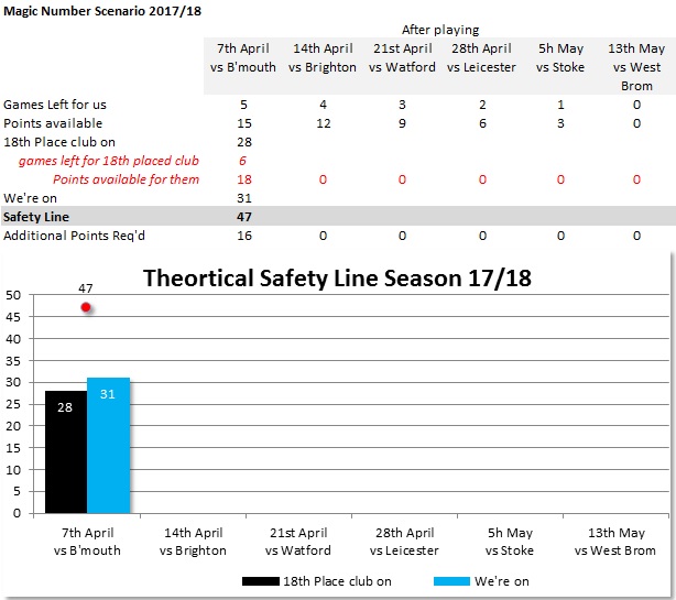 The current magic numbers for each side ignores the game effect of games played against each other. If we start factoring those in, the system becomes much more complex! The current method is each side’s magic number, taken in isolation, which almost certainly overestimates the actual magic number. Not that I’m clutching at straws! If we can finish the season playing as we have done recently, I am sure we have enough about us to finish above West Brom, Stoke and Huddersfield. Finishing above anybody else would be a bonus. It is also based on the team in 18th winning six out of six. Possible - but highly unlikely given that they have to play both Chelsea and Man City in those games.