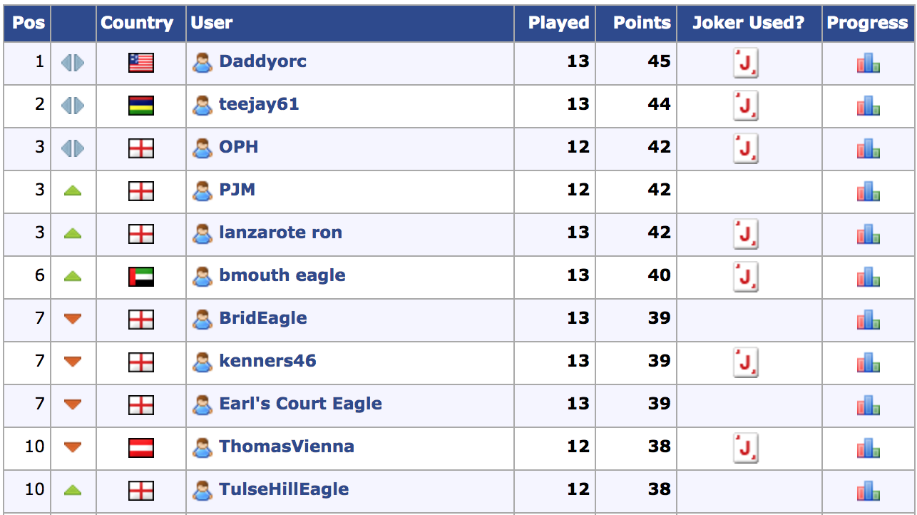 Congrats to Daddyorc for winning the first prediction league of the season! Top 10 attached! The next prediction league of the season which runs until January is now active, and started with the Chelsea game. Get predictiing!