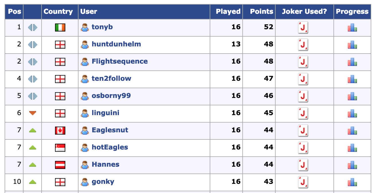Congratulations to tonyb who wins the second Prediction League of the season with 52 points. The 3rd and final Prediction League of the season started with the Fulham game today - get your predictions in for the next few games of the season!