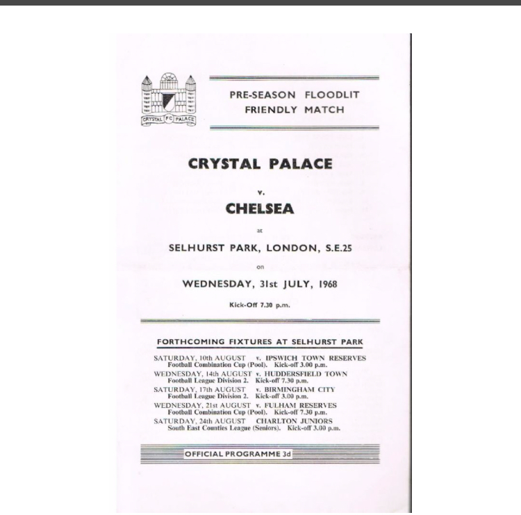 My first game: August 29th 1962, Palace v Shrewsbury, an evening game under the new floodlights. A 2-2 draw. I was hooked. Bought a bobble hat and a rattle which I painted black and white (because they were the colours we were playing in at that time) and went to every home game for years after that.