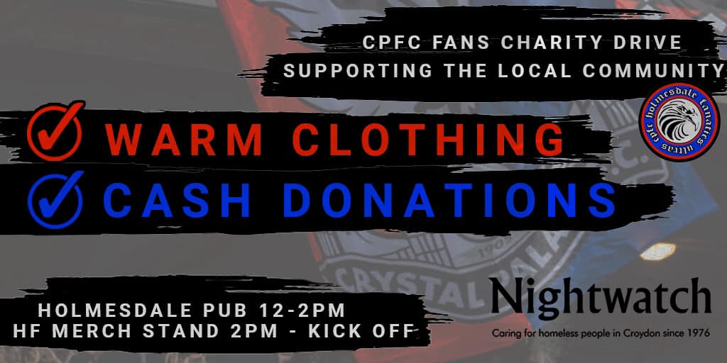 The following is a message from the Holmesdale Fanatics page: As no one in London has failed to notice homelessness and people sleeping on the streets has risen exponentially in recent years. We talk about the idea of “one club, one community” and the important role a football club has to play in creating a better situation for those living within its areas, that is something that should include everyone in the manor, especially those most in need. Croydon Night***ch has been at the forefront of helping the community for over 40 years in this department and it’s now time for us to all play out part as well. We therefore are asking for donations of warm clothing, jackets, or cash to be dropped to the Holmesdale pub on Saturday between 12-2 which will be distributed the following week to those in need on the streets of Croydon. Items can also be brought to the Holmesdale merch stand behind Block E between 2-3pm before kickoff.