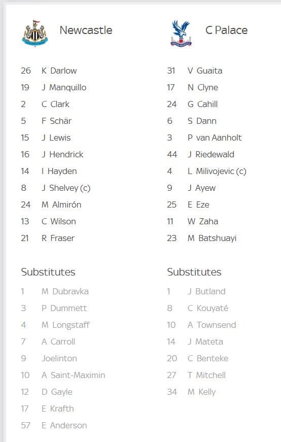 Palace: Guaita, Van Aanholt, Cahill, Dann, Clyne, Milivojevic, Riedewald, Eze, Ayew, Zaha, Batshuayi. Subs: Butland, Mitchell, Kelly, Kouyate, Townsend, Mateta, Benteke. ------------------------- Newcastle: Darlow, Lewis, Clark, Schar, Manquillo, Shelvey, Hayden, Hendrik, Almiron, Frazer, Wilson. Subs: Dubravka, Anderson, Matthew Longstaff, Joelinton, Saint-Maximin, Gayle, Krafth, Carroll, Dummett.