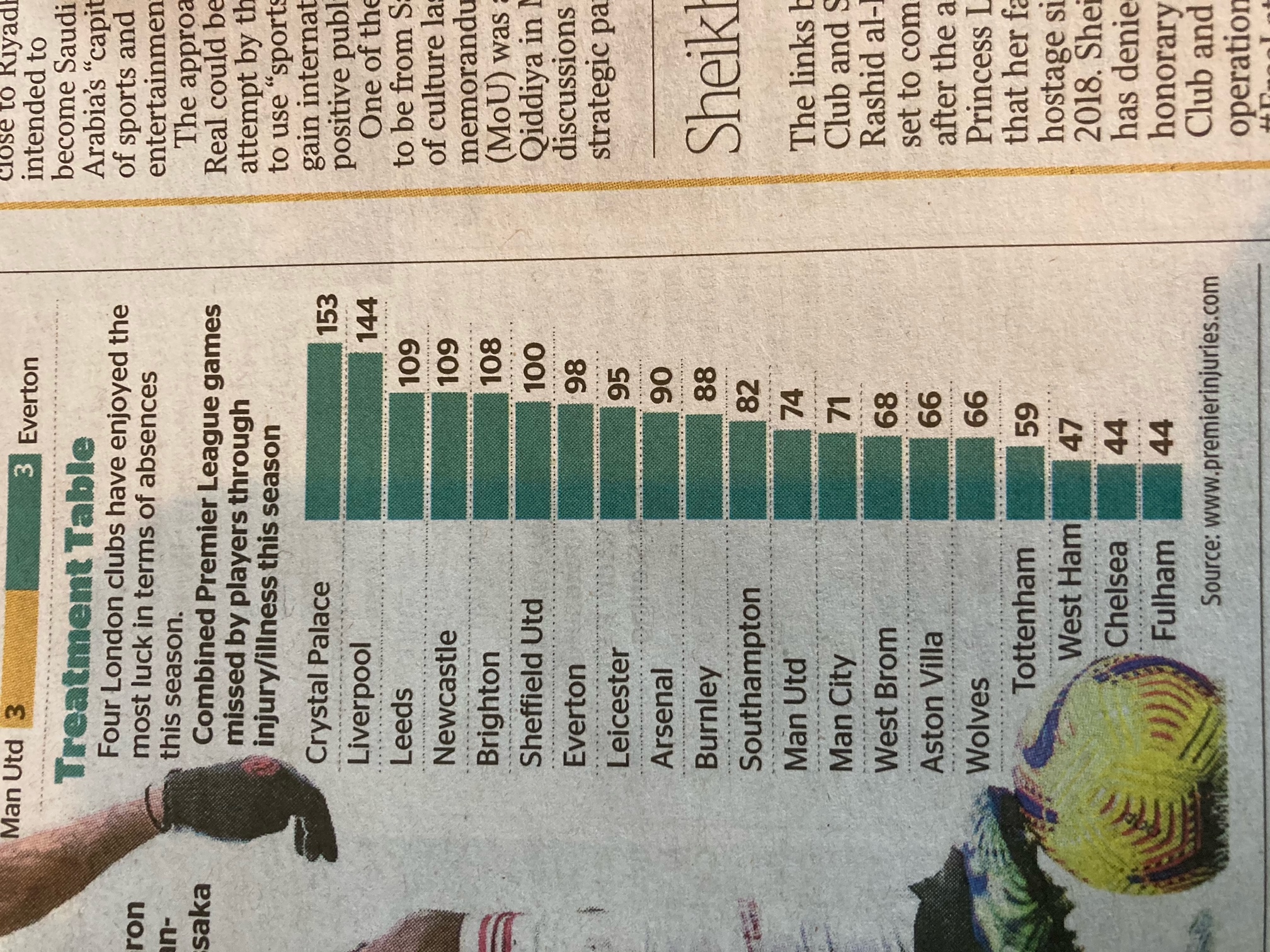 The Times shows this summmary of PL games missed by players due to injury or illness every Saturday. We've been top almost all season, briefly knocked back to second by Liverpool around Christmas.