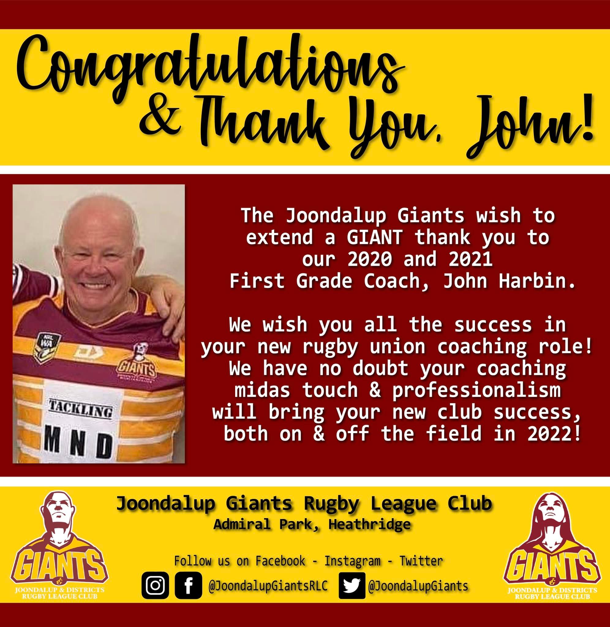 I follow rugby league in the summer months and came across this message about our former fitness coach John Harbin who for the last two years has been Coach to Western Australian team the Joondalup Giants.