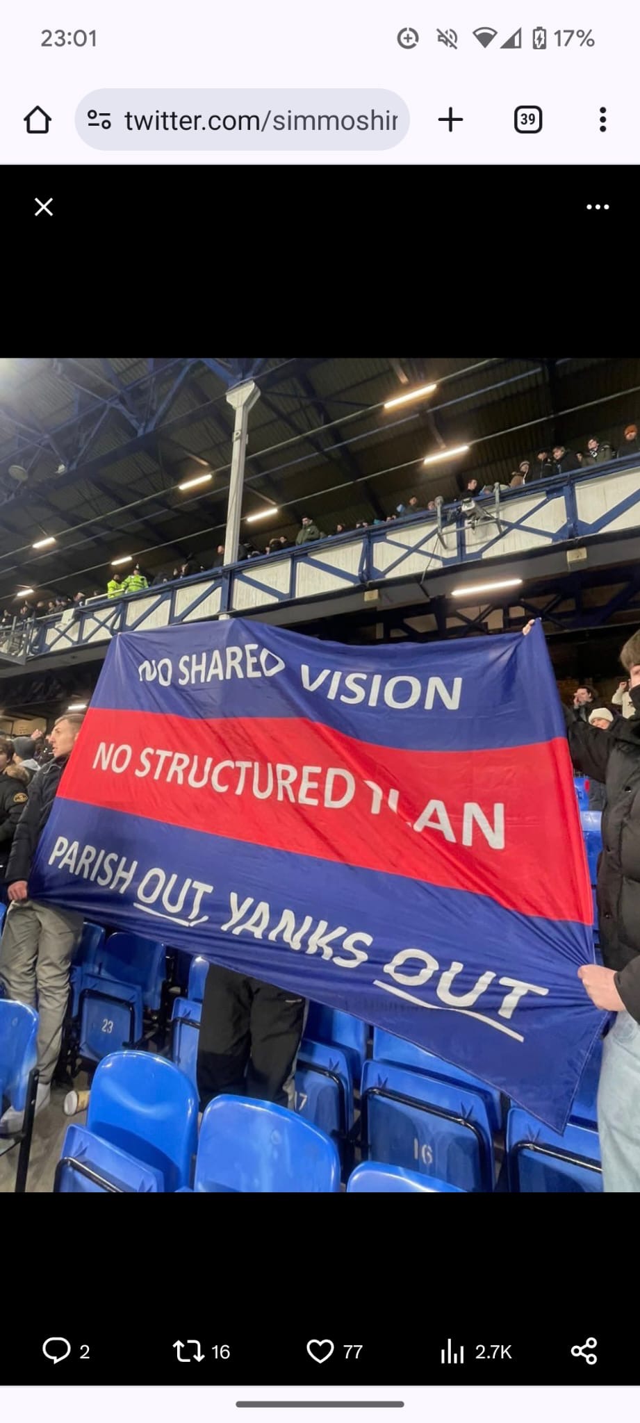 At the end of the day, nobody is in charge of the club, transfers, direction of club, etc, Parish with his 10% holding and 25% voting rights seems to have alienated Textor, Harris and Blitzer who all seem to want to sell instead of invest funds, how we get out of this mess i dont know.